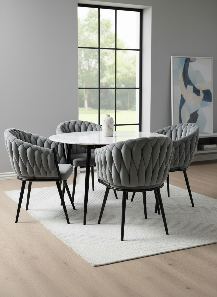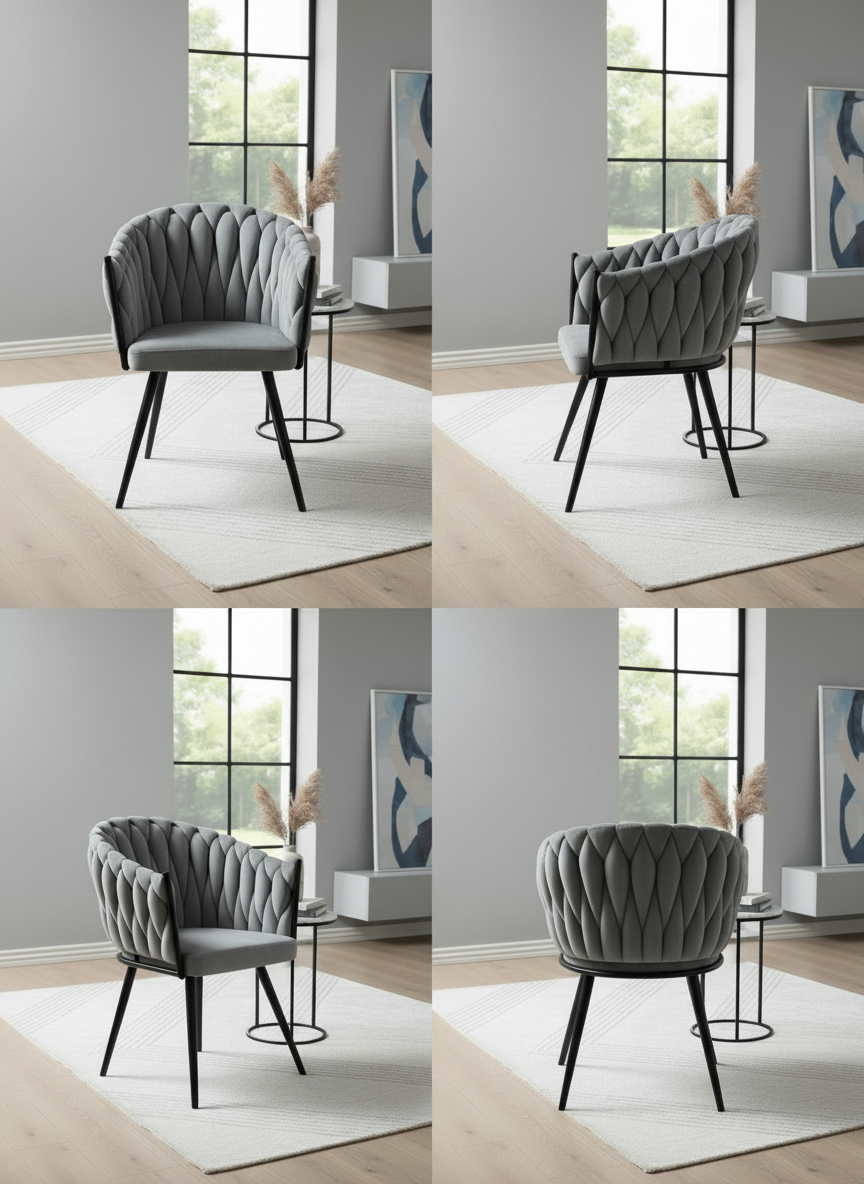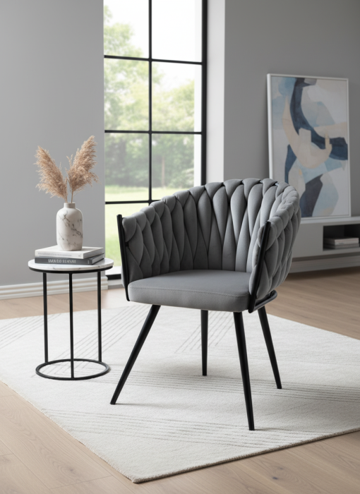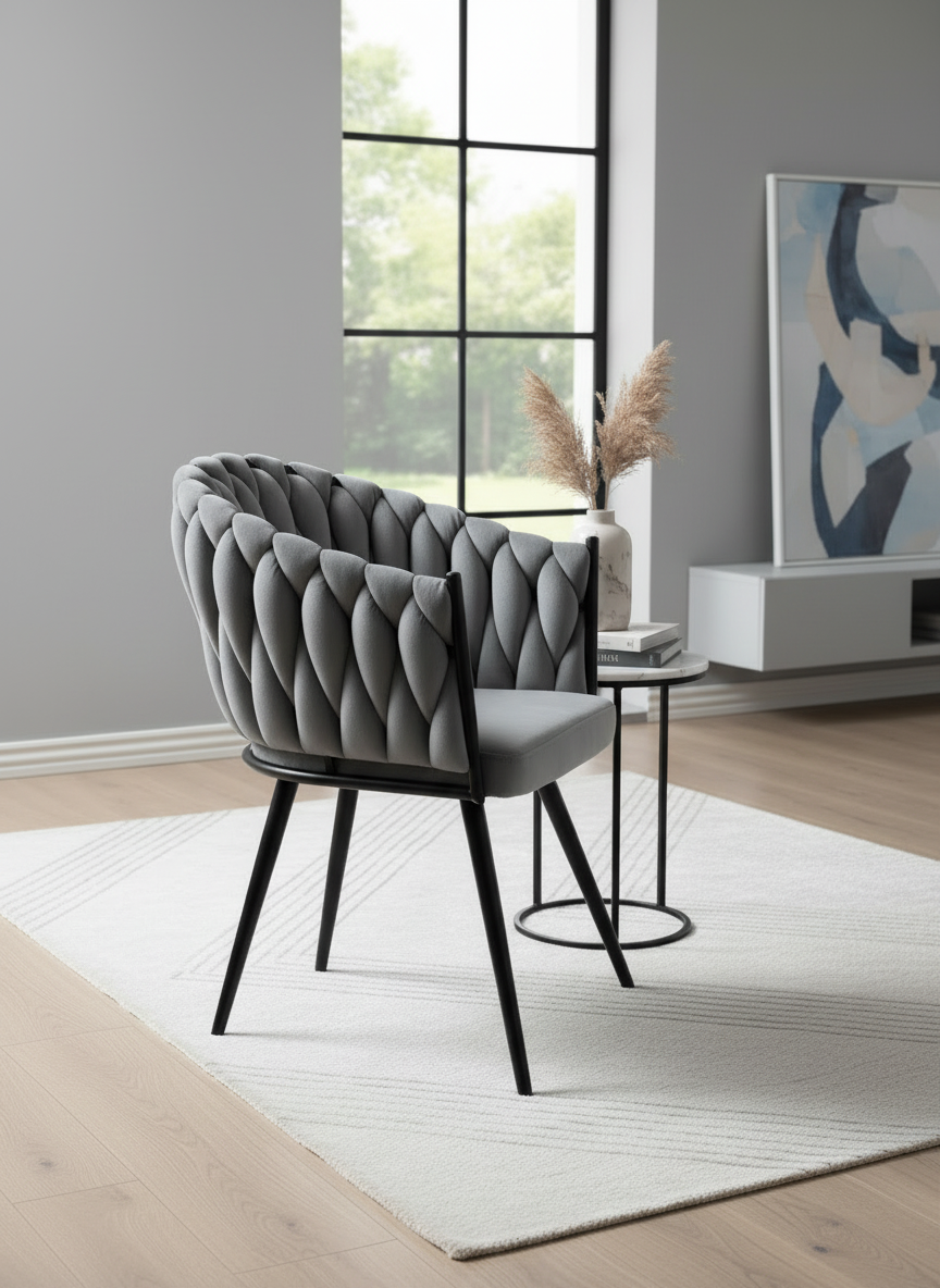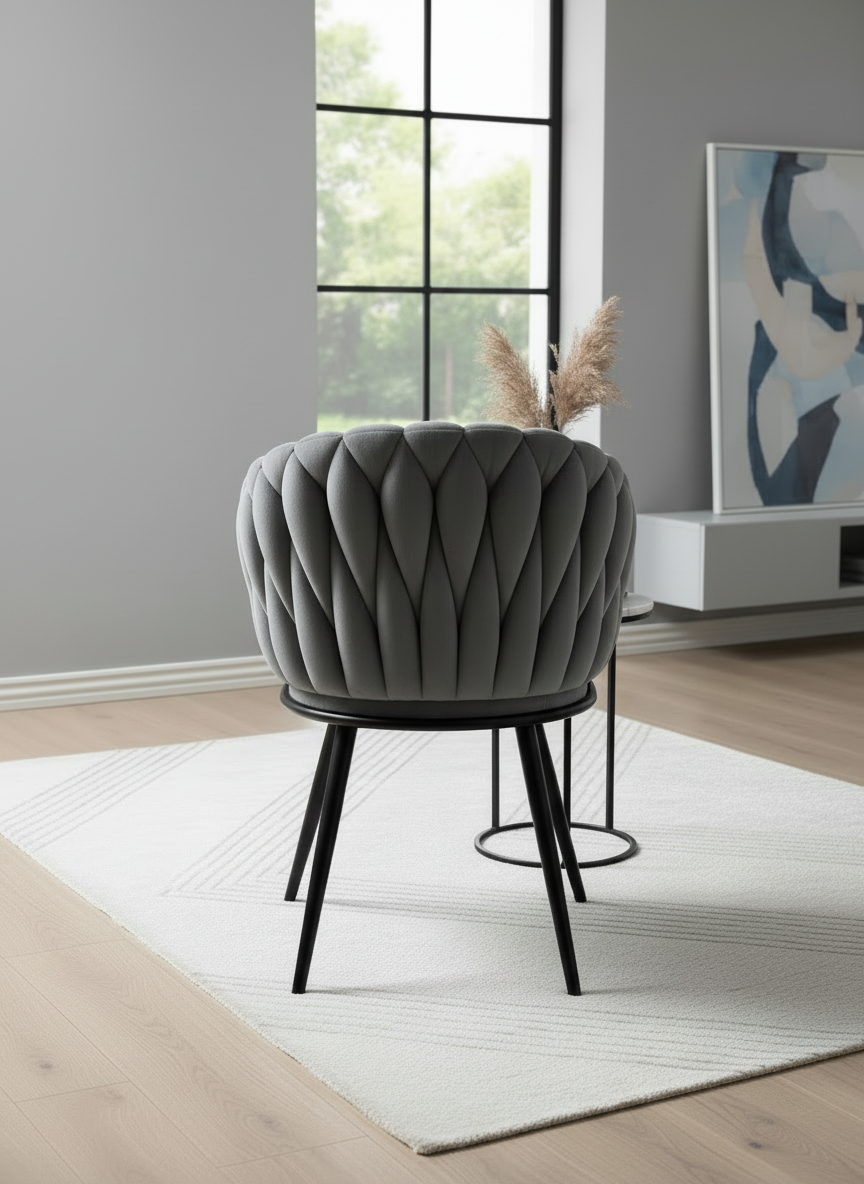 Scaunul impletit gri este un exemplu de stil modern care aduce un strop de prospețime și culoare în orice spațiu. Designul său contemporan îmbină perfect funcționalitatea cu rafinamentul, creând o atmosferă primitoare și plină de viață, ideală pentru a petrece momente de relaxare în compania prietenilor și a familiei.